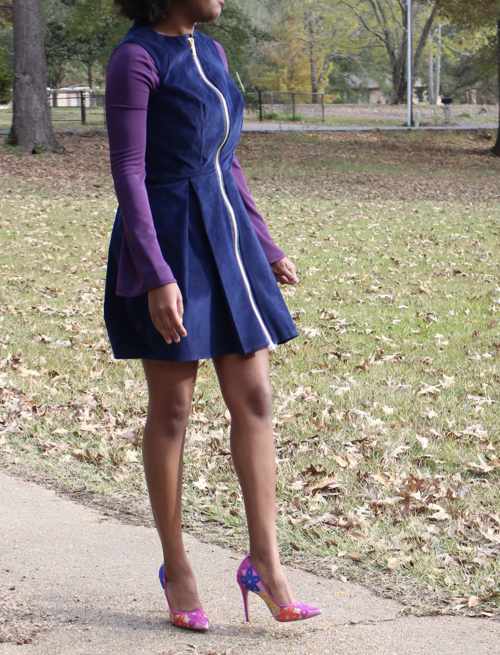 I am so excited to finally be able to share this blog post with you all. It has been sitting in my draft folder for about a month, but it is definitely worth the read. I had the opportunity to test Pipe Dream Patterns newest release Peggy Pinafore. It is her last pattern release for this year and I am so excited to share my version. I decided to make version 2, which is a mini skirt combined with a high neck bodice. I figured this version would look good with, or without tights and I own very few mini skirts.